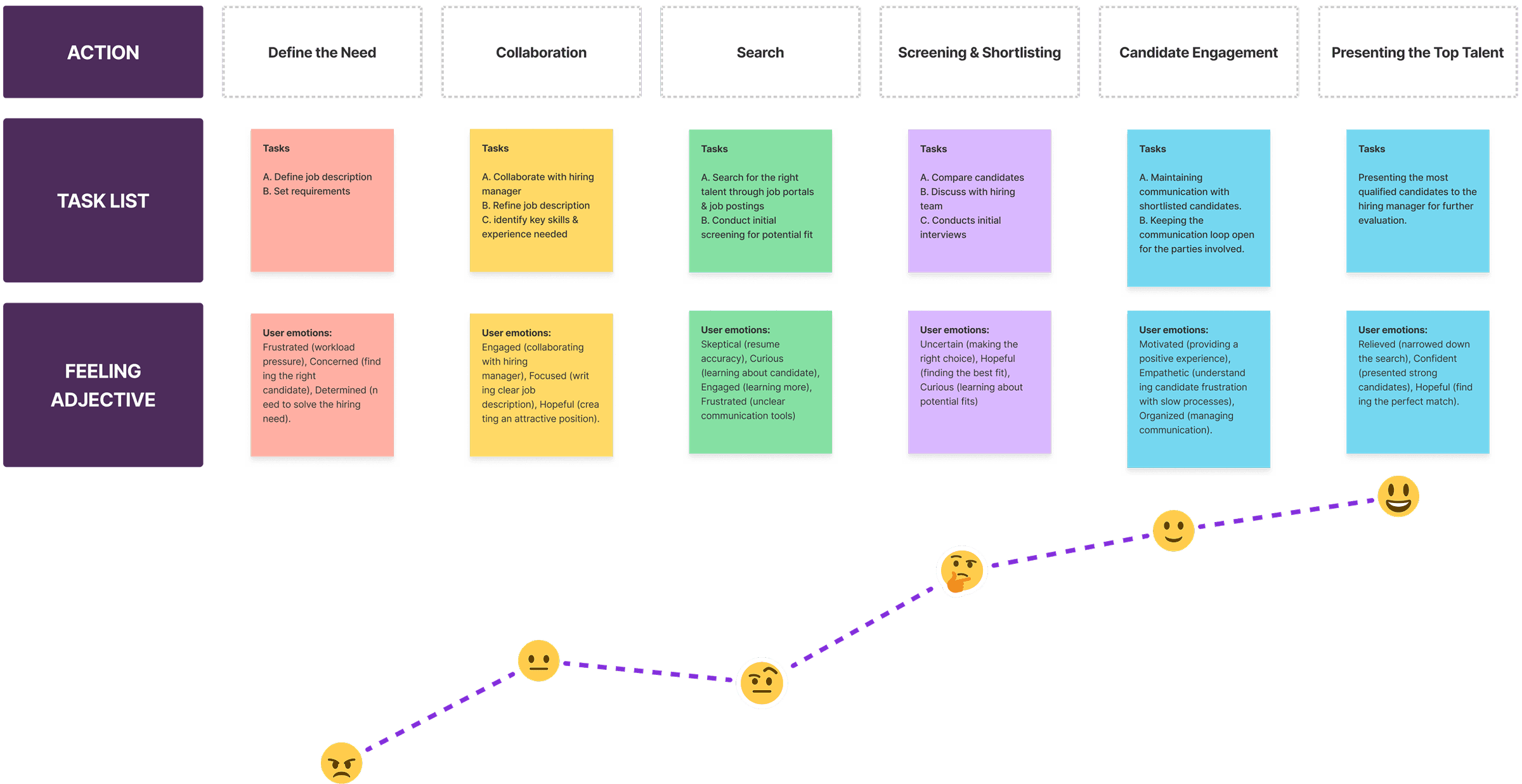 I mapped the recruiter journey—from the excitement of a new role to the frustrations of sifting through irrelevant resumes. The highs and lows revealed where design could truly make a difference.