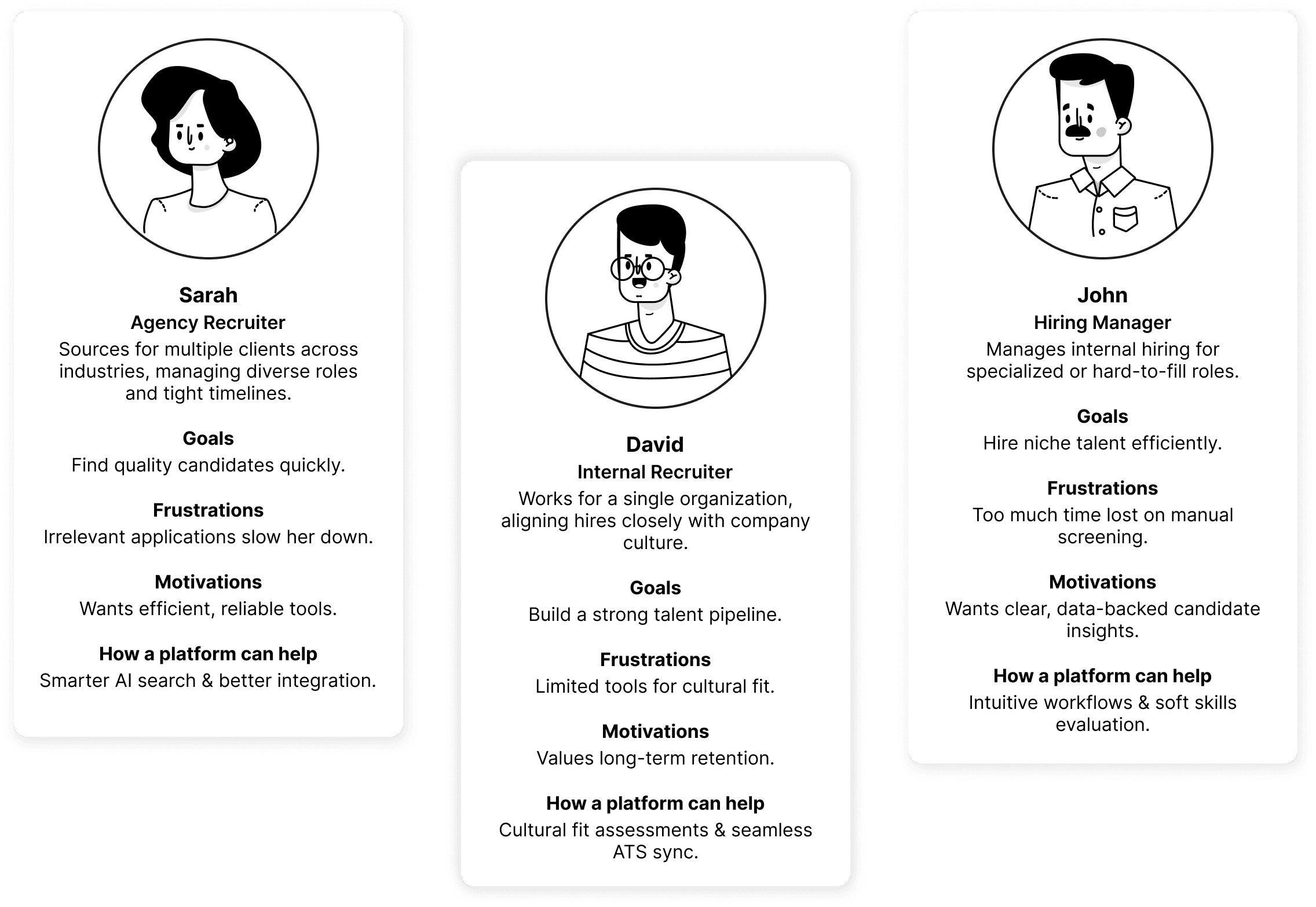 To humanize the findings, I crafted recruiter personas like Sarah (agency recruiter), David (internal recruiter), and John (hiring manager)—each driven by efficiency but slowed down by outdated tools.